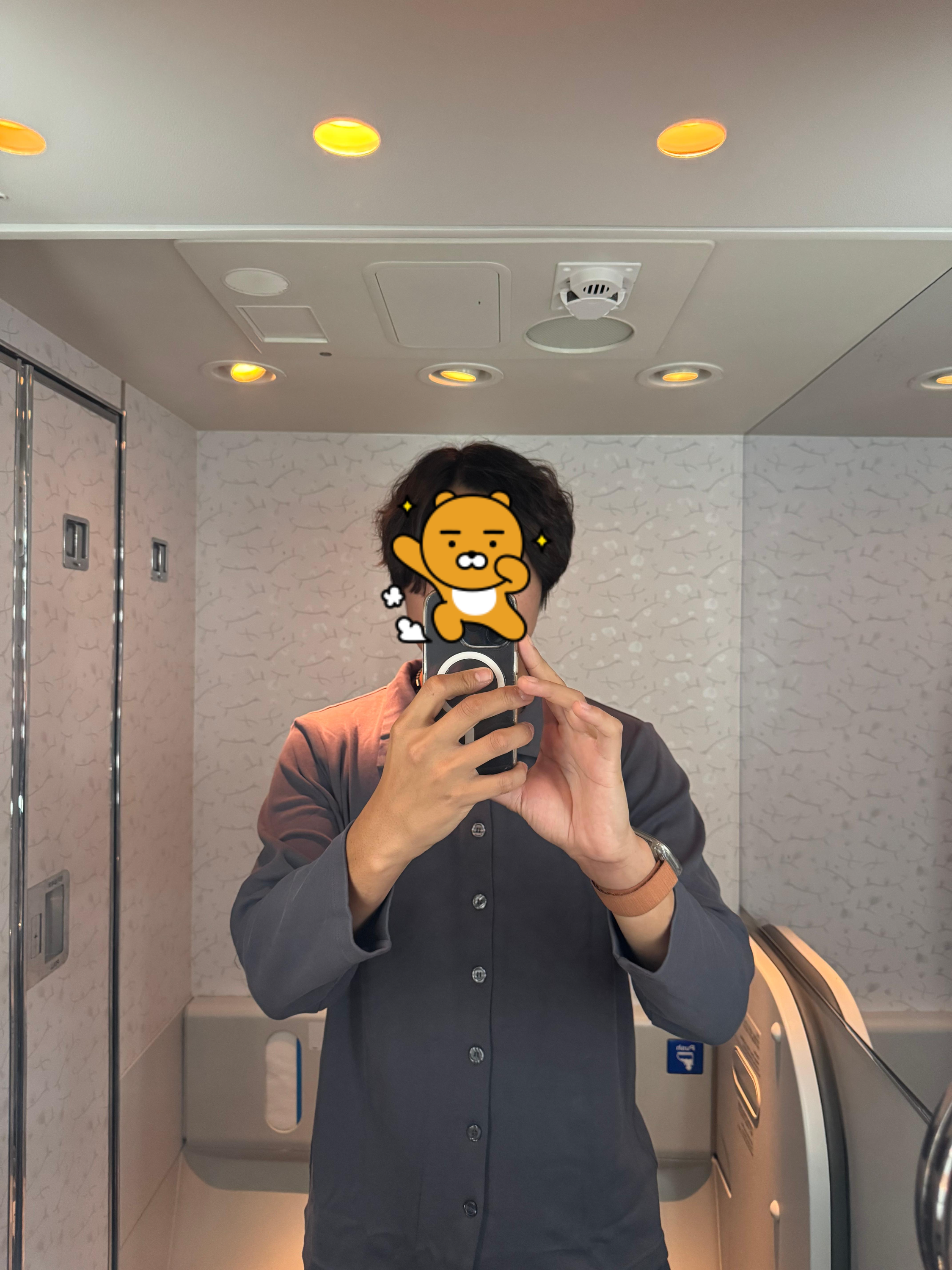 식사를 마친 후에는 화장실로 가서 잠옷으로 환복을 한다. 다른 유튜브 영상에서 대한항공 일등석에서 가장 아쉬운 부분이 바로 화장실이라고 했었는데, 공간이 조금 더 넓다는 것과 핸드 타월이 비치되어 있다는 것을 제외하고는 진짜 이코노미 화장실과 크게 다를 게 없었다.